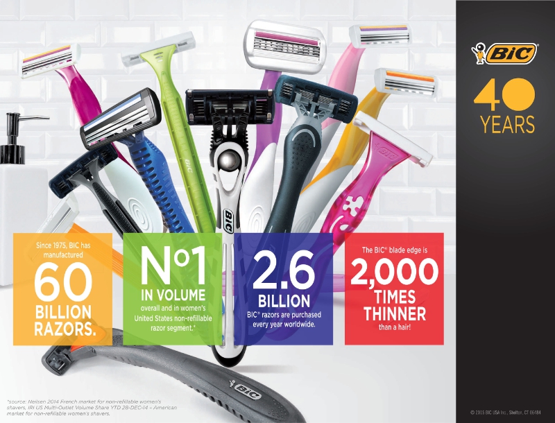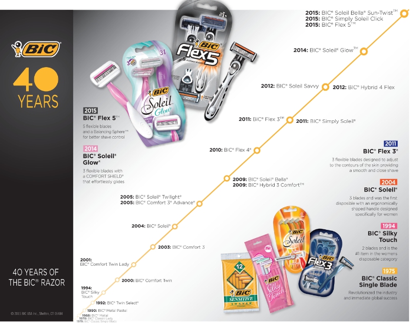 SHELTON, Conn., Nov. 9, 2015 During 2015, BIC is celebrating 40 years of razor manufacturing. Since the launch of its first razor, the BIC® Classic, in 1975 and its first women’s razor, the BIC® Classic Lady in 1978, BIC has introduced a series of increasingly innovative and successful product lines including BIC Flex for men and BIC Soleil® for women.