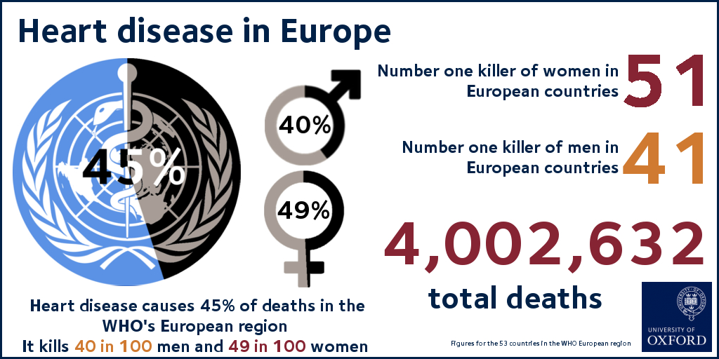 Cardiovascular disease (CVD) is the main cause of death in Europe, accounting for nearly half (45 per cent) of all deaths, according to a new Oxford study funded by the British Heart Foundation (BHF).