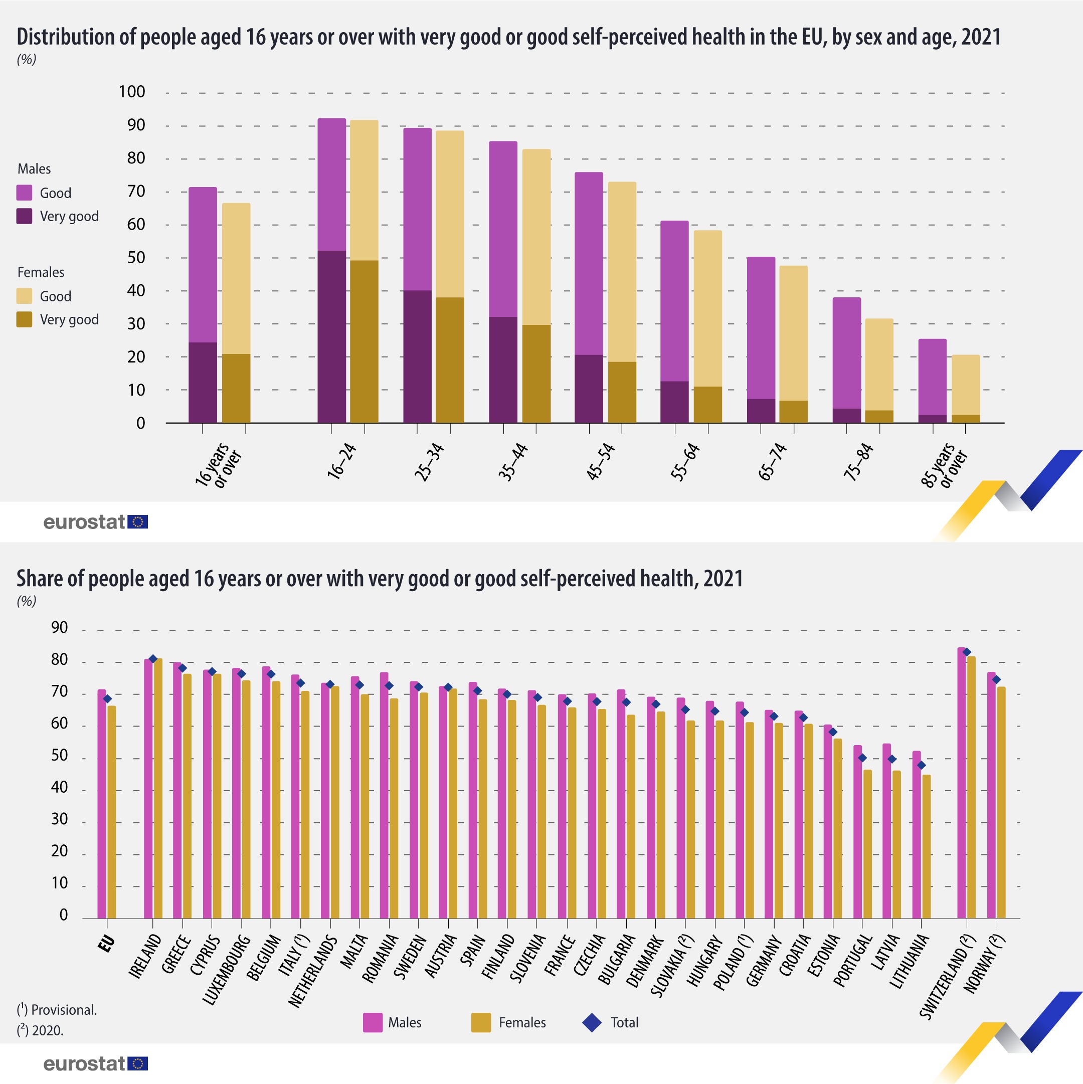 In 2021, in the EU, almost seven in ten people aged 16 or over rated their health status as good or very good (69%). The positive perception of health was better among males than females (72% of males compared with 67% of females).