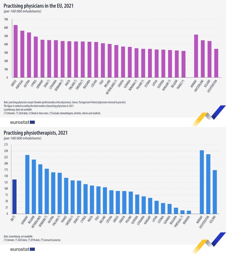 Among the EU countries, Greece (629.2) and Portugal (562.0) recorded the highest numbers of physicians (physicians licensed to practise) per 100 000 inhabitants, followed by Austria (540.9). By contrast, the lowest ratios were registered in France (318.3), Belgium (324.8) and Hungary (329.8).